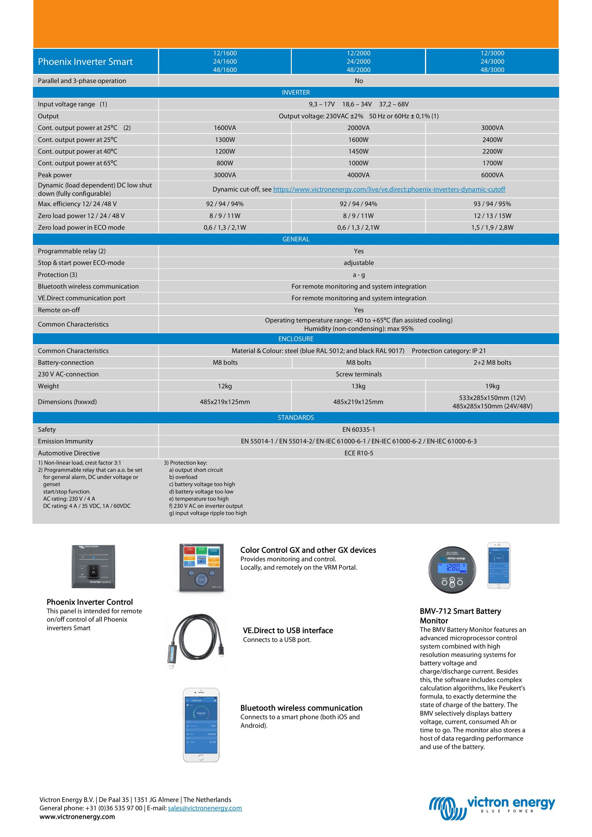 The Phoenix Inverter Smart is an efficient and reliable inverter. Built on our proven and field tested Phoenix inverter platform, it now comes with a new slimmer design and full metal casing. Models are available in 1600VA, 2000VA, 3000VA and 5000VA for 12, 24 or 48V systems.