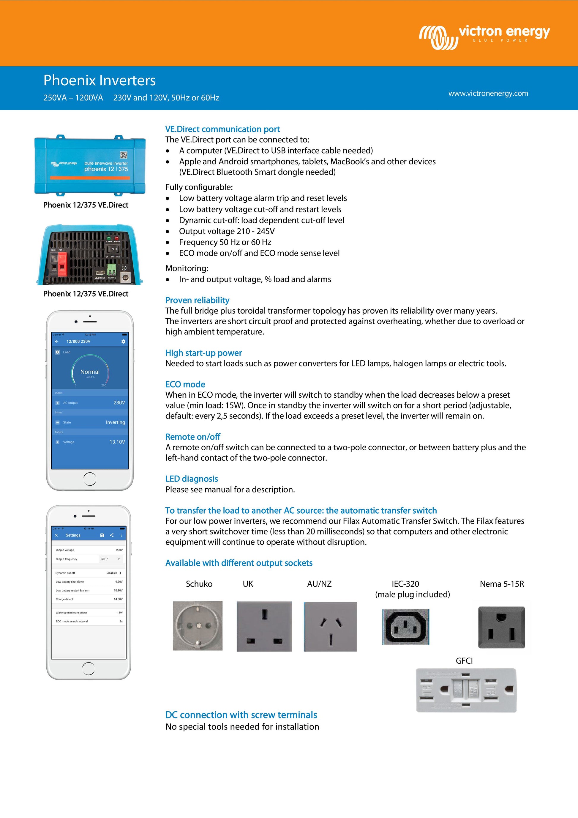 The full bridge plus toroidal transformer topology has proven its reliability over many years. The inverters are short circuit proof and protected against overheating, whether due to overload or high ambient temperature.